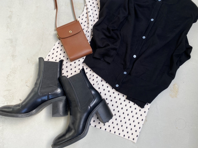 モノトーンのドット柄のワンピースを主役にすれば、ほどよいレトロ感を楽しめるうえ、メンズライクなテーラードジャケットと組み合わせると、ミックスコーデが完成します。
