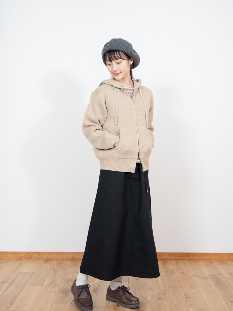 ゆるっと感がかわいらしいオーバーサイズのパーカーに、スカートを合わせると、女性らしさと抜け感を演出できます。
