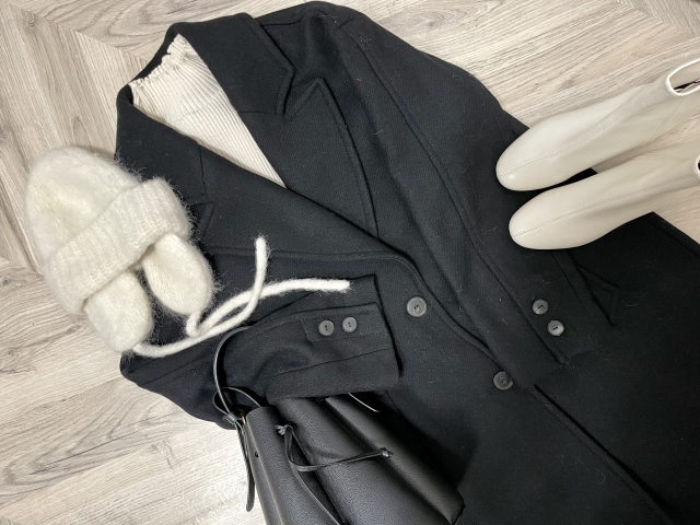 ベージュのノーカラーコートを羽織って、デニムはブラックデニムをチョイスすると、大人っぽく仕上げることができます。