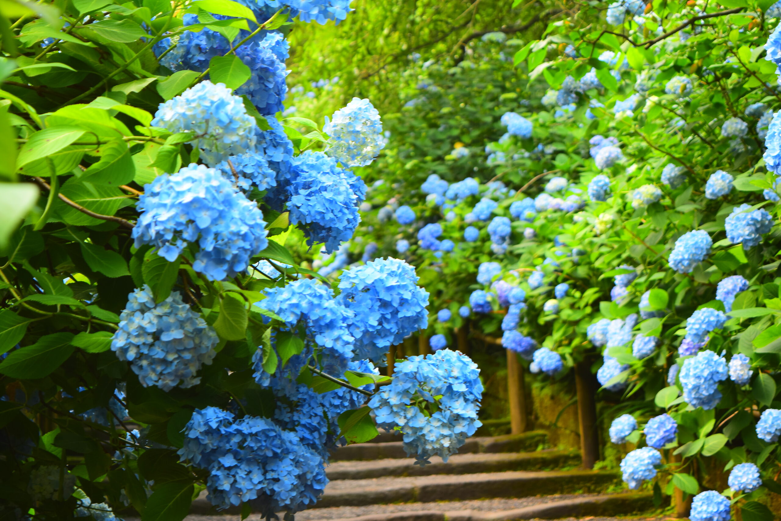 石段の両脇を埋め尽くす青い花々は、雨が滴ることで一層鮮やかさを増し、しっとりとした趣を添えます。