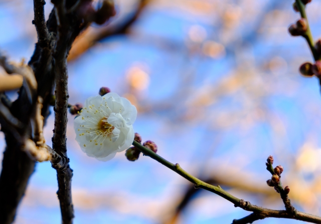 冬は水仙や椿、蝋梅(ロウバイ)、紅梅、枝垂れ梅(しだれうめ)、福寿草といったさまざまな花を見ることができ、冬の済んだ空気のなかで花の香りが漂ってきます。