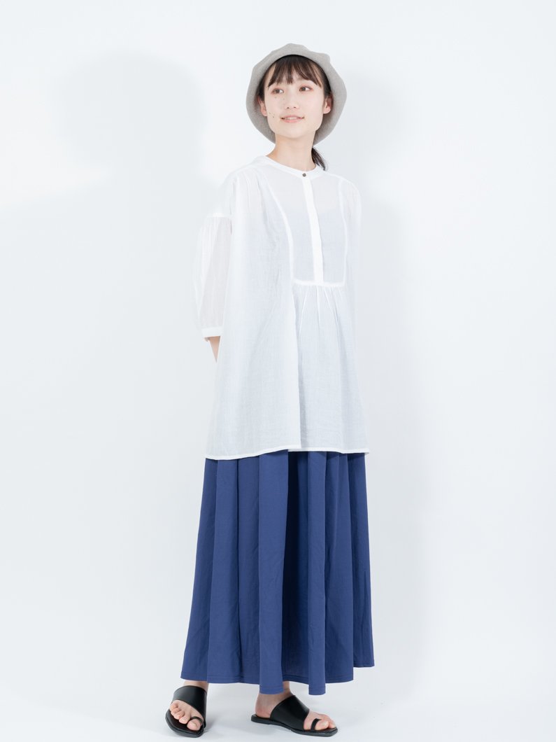 トレンドのタックブラウスは肌の露出を抑えられるうえに、紫外線対策にもなるので夏にはもってこいのアイテムです。