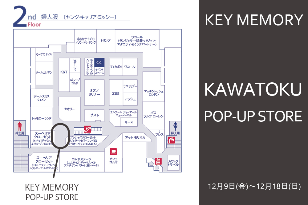 KEYMEMORYが、再び岩手県盛岡市に進出します!!地元で有名な「川徳百貨店」(パルクアベニューカワトク)でのPOPUP開催が決定致しました!今回は新作の冬物商品が多数入荷致します!お近くにお住まいの方、前回のイベントでキーメモリーを知った方、是非!川徳パルクアベニューカワトク2階にお越しください。