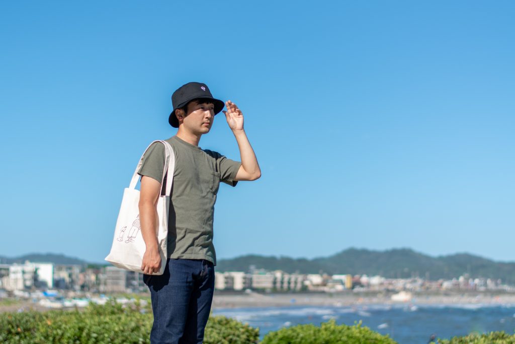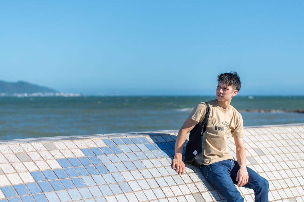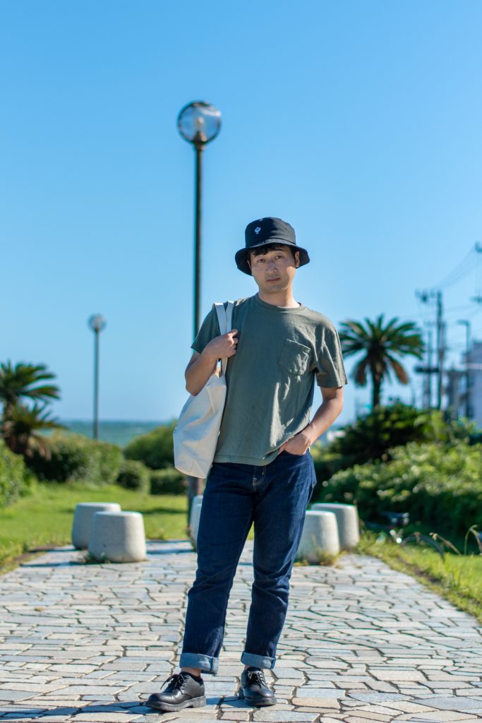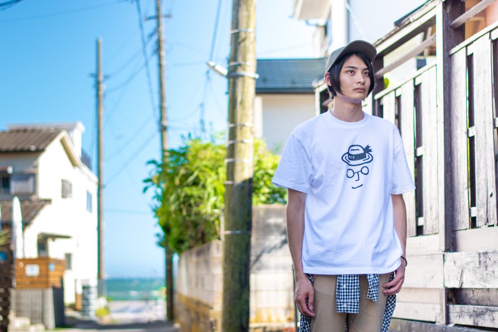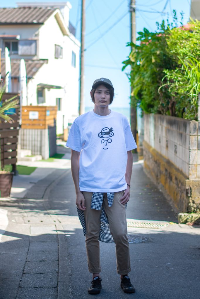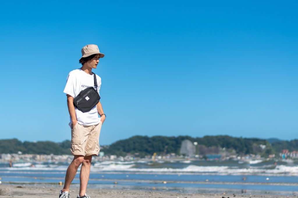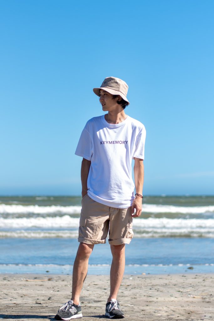 スタッフ『いっぺい』がおすすめするのは、キーメモリーのロゴTシャツ。こちらはオンラインショップ限定の商品で、ロゴのカラーがブラック、イエロー、レッド、スカイブルー、ネイビーブルー、グリーンの6色から選ぶことができます。今回はメンズに大人気のサコッシュとショーツを合わせたコーディネートで、Tシャツは大きめに着用しています。