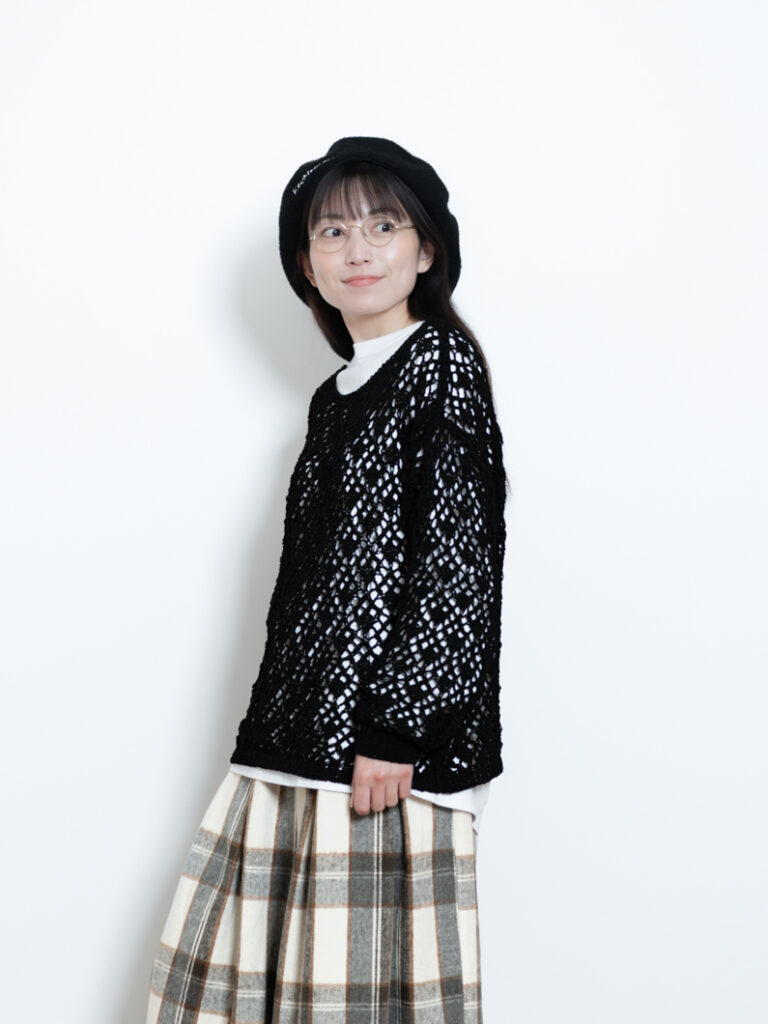 【オンライン限定販売商品】編地に特徴があり、レイヤードスタイルも楽しめるゆるっと落ち感のあるニット。本格的な冬ニットの前に、朝晩や日によって変わる気温にも合わせやすく、取り入れやすい1枚です。カットソーやシャツの上からさっと重ねるだけで、素材感のあるレイヤードスタイルが完成します。程よく太めの糸で立体的に編み、透かし部分で抜け感を演出。インナーをチラ見せすることで、編地の特徴を活かした着こなしが楽しめます。アウターの中でもアクセントになる1枚です。身幅はゆったり、裾と袖口は同素材のリブ編み、着丈はすっきり目に仕上げています。裾からインナーを見せたり、タートルネックと合わせたり、幅広い着こなしが可能です。