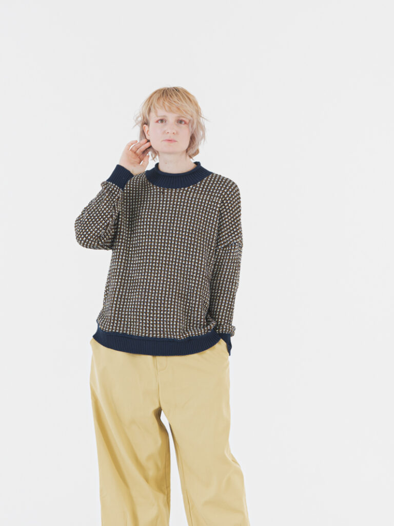 ジャガードの織りと配色にこだわった、ワンポイントにおすすめのニット。昨年も大好評で即完売したアイテムです。特徴はジャガードの格子柄で、柄物でも取り入れやすく仕上げています。さらにニットには3色の糸を使用しており、カラーごとに雰囲気が異なるので、お好みの1色をぜひお選びください。少し高さのある首元で暖かく、先端がくるっと捻じれるデザインが柔らかい印象に。スリットと後ろ裾の丸みが可愛らしさをプラスします。全体的にゆったりサイジングで体型カバーもしつつ、ジャガードの柄を贅沢に見せるデザインです。ゆるっとしたシルエットに単色リブでメリハリを持たせ、チクチクしない柔らかいニット地を使用。さらにマシンウォッシャブルでお手入れも簡単です。