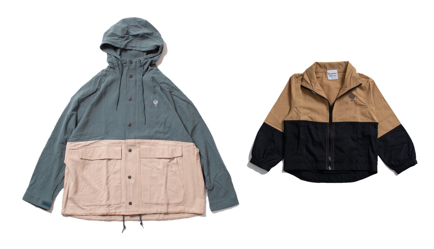 上下の生地切り替えが印象的な「Windbreaker big pocket」と「kids mountain jacket」で合わせるリンクコーデ。