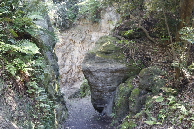 道中の「切通」とよばれる、山を開削し人馬の交通を行えるようにした歴史的な道を通り、山頂へ向かって歩きます。
