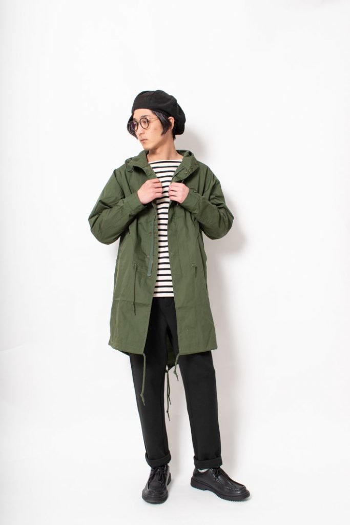 カーキカラーは、どんなトップスやボトムスも合わせやすく、シンプルなデザインのモッズコートはミリタリーコーデ初心者の方にもおすすめです。