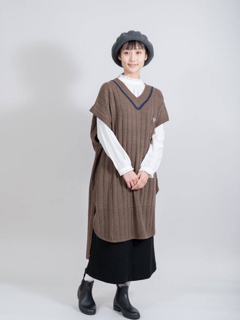 カットソーやシャツ、ワンピースなどの幅広いアイテムにレイヤードでき、中に着るアイテムによって印象をガラリと変えることができます。