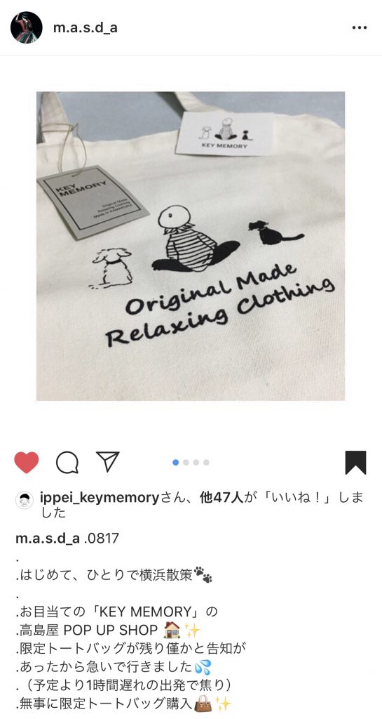 先日行った、「KEYMEMORY横浜高島屋POPUP」にて販売した『横浜高島屋限定トートバッグ』。POPUP開催から3日間で完売致しました。そんな中、3日目ギリギリでトートバッグを購入頂いたお客様の投稿です!イラストも素敵に撮っていただいてありがとうございます!