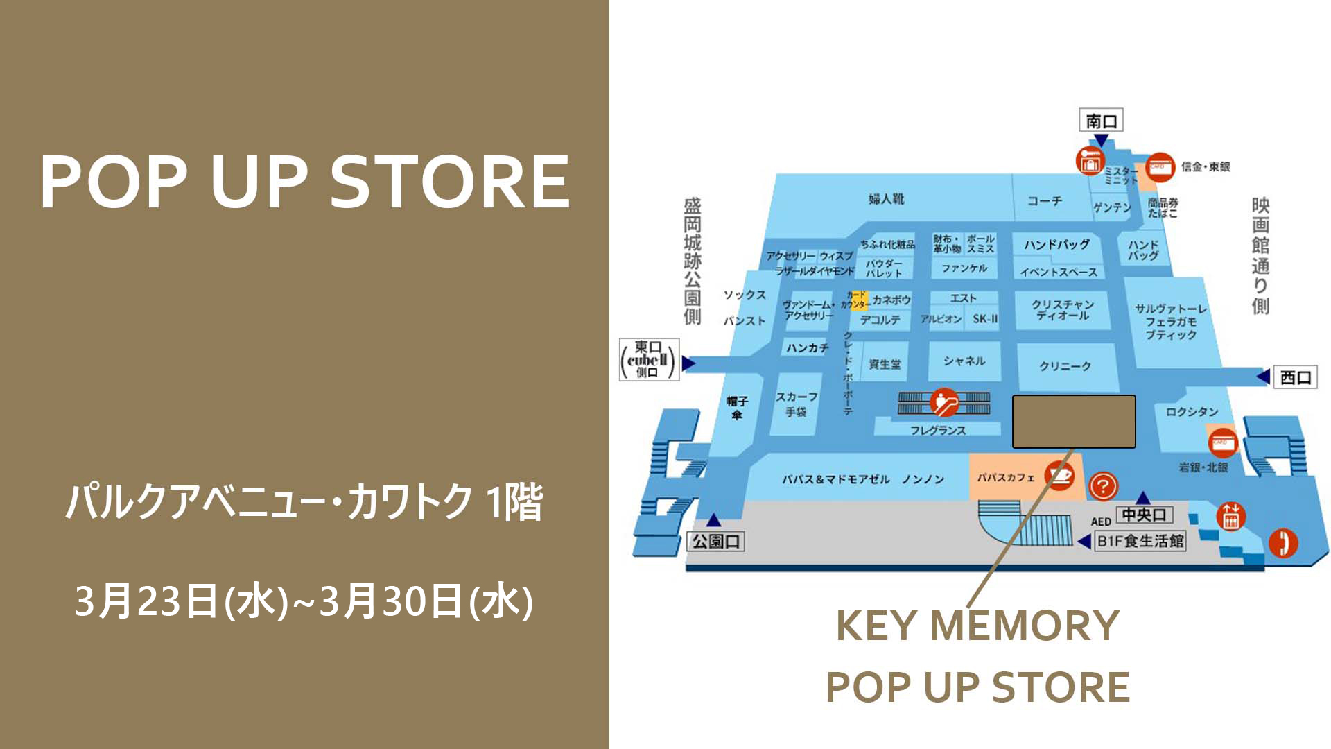 KEYMEMORYが、再び岩手県盛岡市に進出します!!地元で有名な「川徳百貨店」(パルクアベニューカワトク)でのPOPUP開催が決定致しました!今回は新作の春物商品が多数入荷致します!お近くにお住まいの方、前回のイベントでキーメモリーを知った方、是非!川徳パルクアベニューカワトク1階にお越しください。