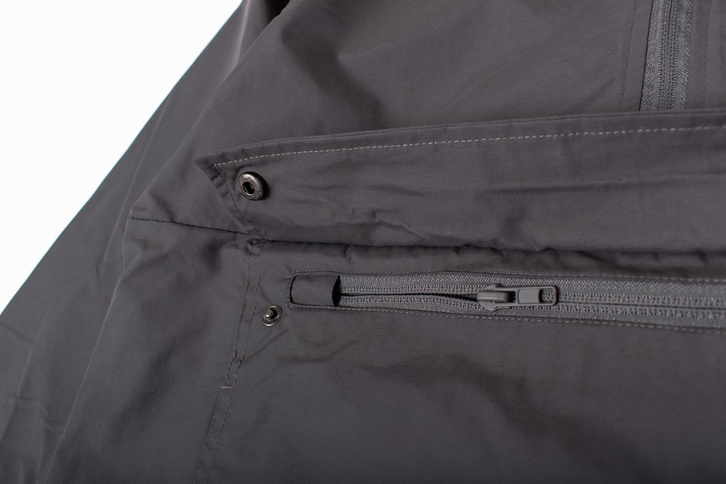 裾の左右内側についたアジャスターを締めれば雨風をしっかり防ぐことができ、フードの内側にはメッシュがついているので蒸れを軽減してくれます。