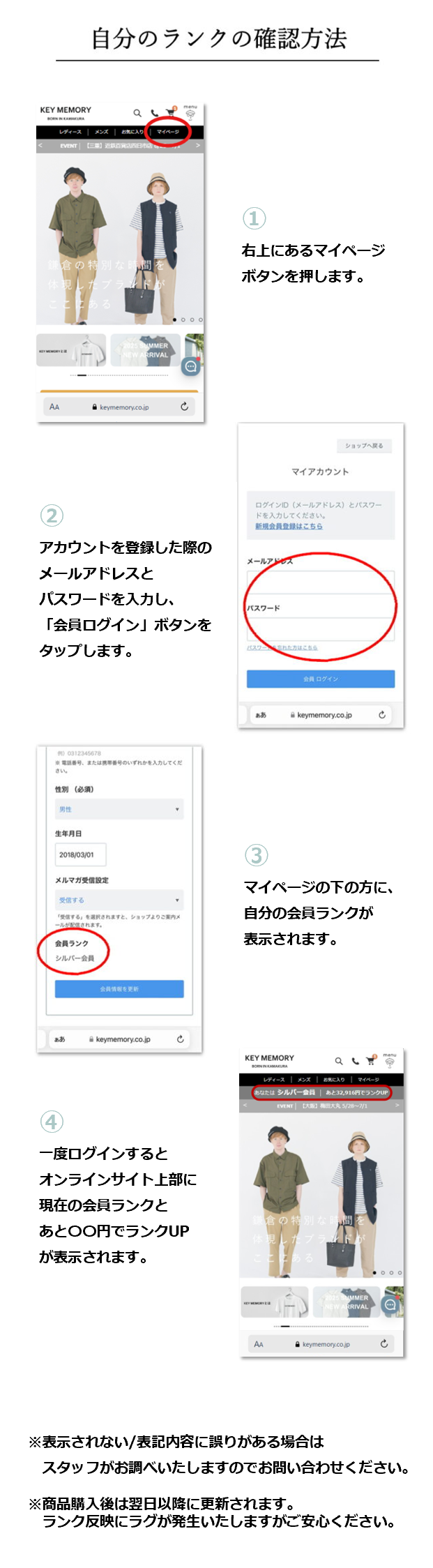 KEY MEMORY Online Shop での累計購入金額に応じて会員ランクが決定!会員ランクが上がれば、ポイントの付与率が1%から最大10%まで上がります。お客様の会員ランクについては[マイページ]よりご確認頂けます。(※下記に説明あり。)貯まったポイントは1ポイント1円として、次回お買い物よりご利用いただけます。また、会員ランク付与には、「会員登録」が必要です。