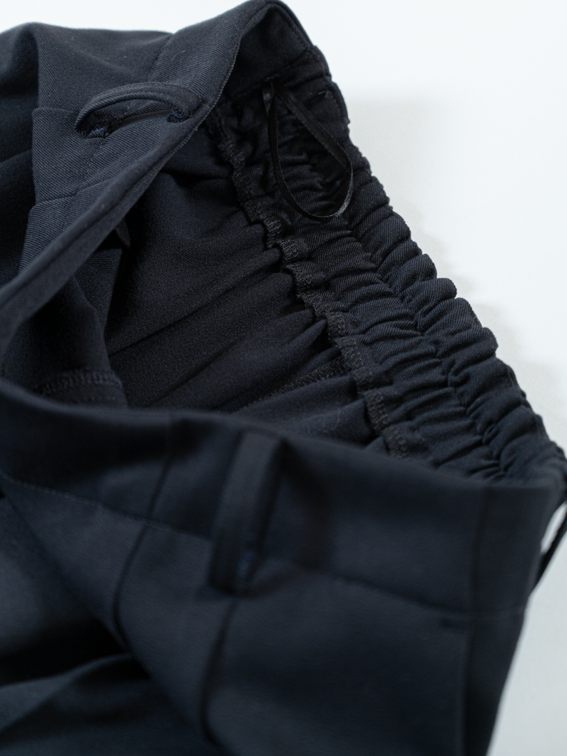 ボトムスは、膝から下に向かって少しずつ細くなるテーパードシルエット。背面にゴムを入れることで、窮屈さを感じずにご着用いただけます。ベルトループもあるので、お好みのベルトでウエストマークすることで背面ゴム部分が隠れ、苦しくないのにきちんと見えも叶います。