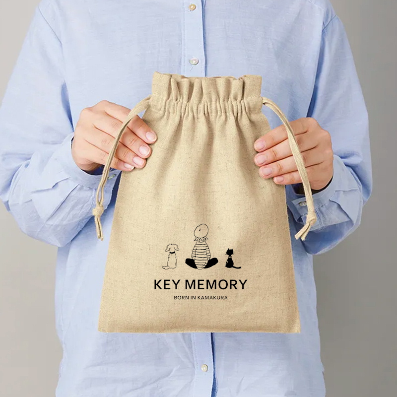 札幌大丸ポップアップのノベルティは、KEYMEMORYオリジナル巾着です!コットンとリネンを織り合わせた、チュラルな風合いの生地がおしゃれなコットンリネン巾着。リネンを含んでいるのでシャリ感も感じられ、ナチュラル派の方にもカジュアル派の方にもおすすめです。口をしばると上部分がくしゅっとなり、かわいいドレープ感を楽しめます。旅行時の衣類や小物の収納袋としてとても便利です!