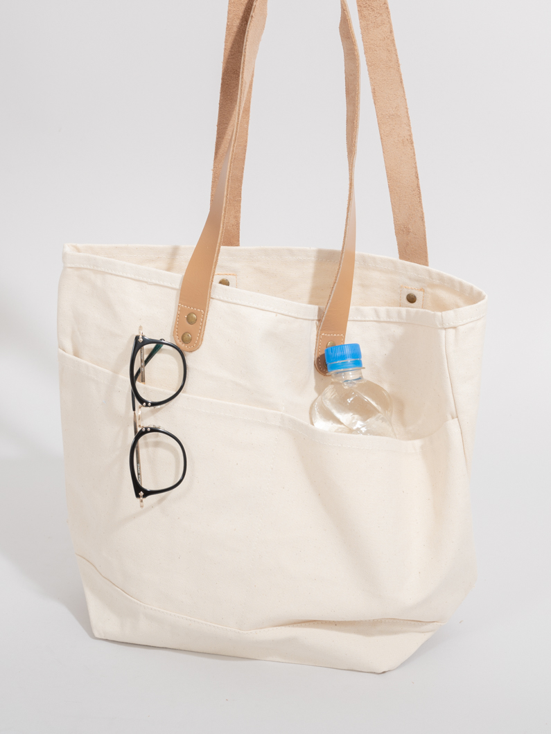 シックでおしゃれなレザーハンドルが魅力!超厚手で丈夫なキャンバス素材トートバッグです。カジュアルでありながらも上品なデザインなので、様々なコーデにマッチします。外ポケット付きなので、財布やパスケースなど細かいものも収容しやすい設計!マチもしっかりとついているので、通勤通学用にも便利なサイズです!