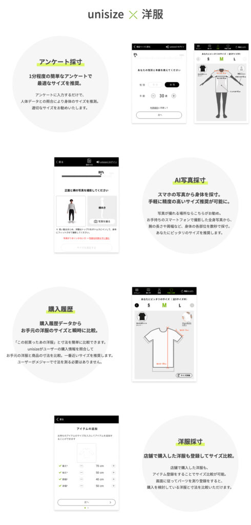 unisizeはネット通販におけるサイズ選びの新たな体験です。いくつもの方法からあなたにぴったりなサイズをご提案します。