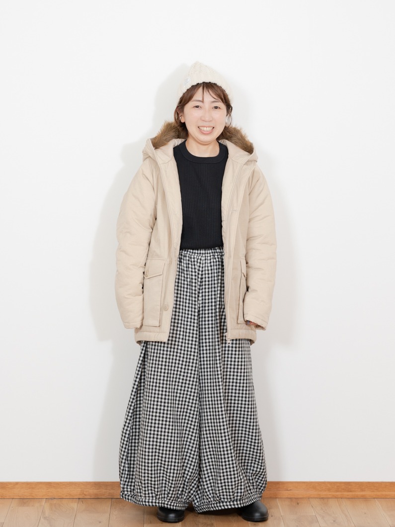 裾に向かって広がるボトムスはこれくらいのミドル丈のアウターとの相性がよく、暖かさを保ちつつボトムスのシルエットの良さも活かしたままコーディネートを組むことできます。