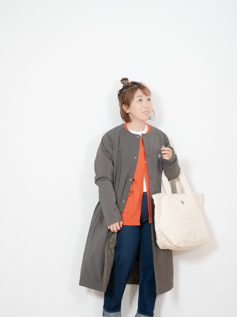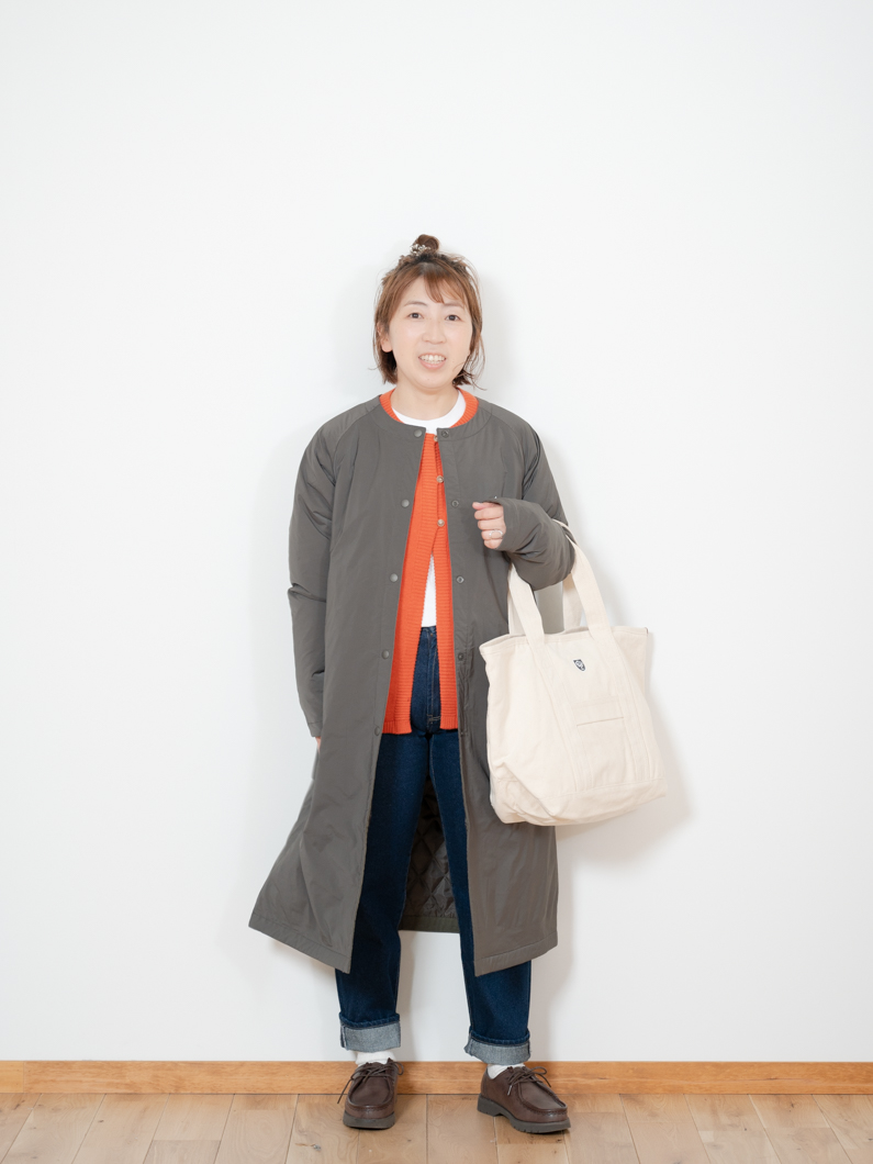 冬のアウターの中では比較的軽くて薄手のコートにはなりますが、秋の初めには長袖Tシャツやブラウスを合わせて、冬には今回のコーデのようにカーディガンと重ね着をすることで暖かく着用することができるので、長い季節着用することができます。