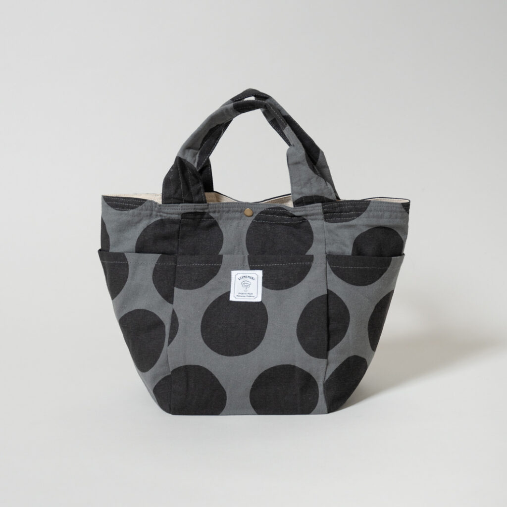八木橋百貨店ポップアップのノベルティは大きいドット生地を使用したミニトートバッグ。底に丸みのあるぽってとしたフォルムがかわいいミニトートバッグ。外側に3つポケットが付いているので収納力抜群のアイテム。ガバッと開ける大口デザインが特徴です。お弁当や水筒、軽めの荷物が入るサイズ感なのでランチトートとしてもお使いいただけます。